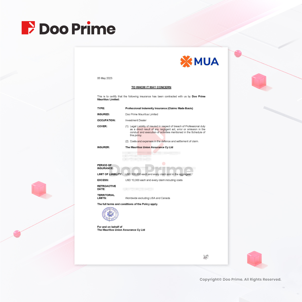 Doo Prime has always prioritized client interests and is committed to safeguarding clients’ funds in various ways. Recently, Doo Prime’s entities have successfully renewed their professional indemnity insurance (PII) with leading insurance organizations, continuing to provide solid professional third-party protection for clients’ investment interests.