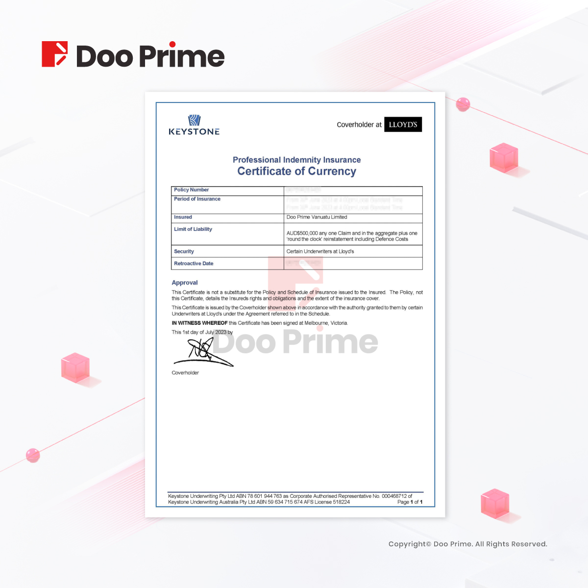 Doo Prime is pleased to renew its Professional Indemnity Insurance (PII) with two leading insurance organizations as the quality of their insurance products is renowned globally. This is one of the top financial securities guarantees that Doo Prime aims to provide to its clients.