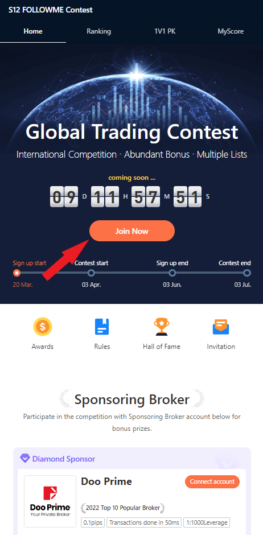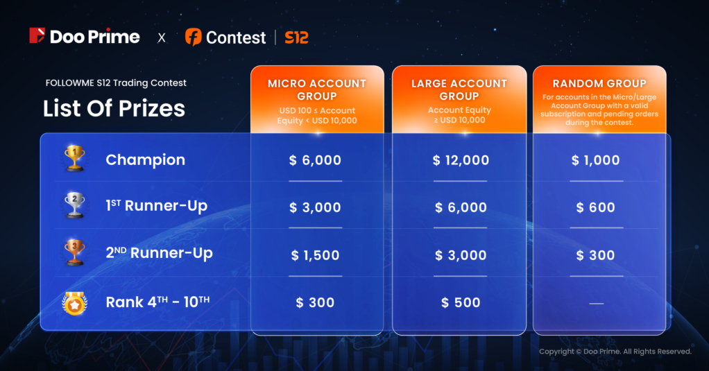 Time to test your best trading techniques with the top industry professionals; the opportunity of a lifetime awaits. The FOLLOWME S12 Trading Contest registration channel is now open, so sign up for a Doo Prime account and be in the running to win the contest with bonuses, rewards and so much more.