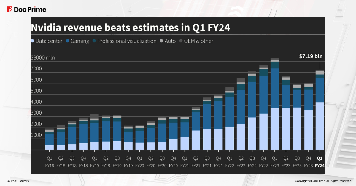 In NVIDIA’s Q1 FY2024 financial report, its revenue and net profit exceeded market expectations. Notably, within its four major business segments—data centers, gaming, professional visualization, and automotive—the data center business has shown consistent revenue growth.