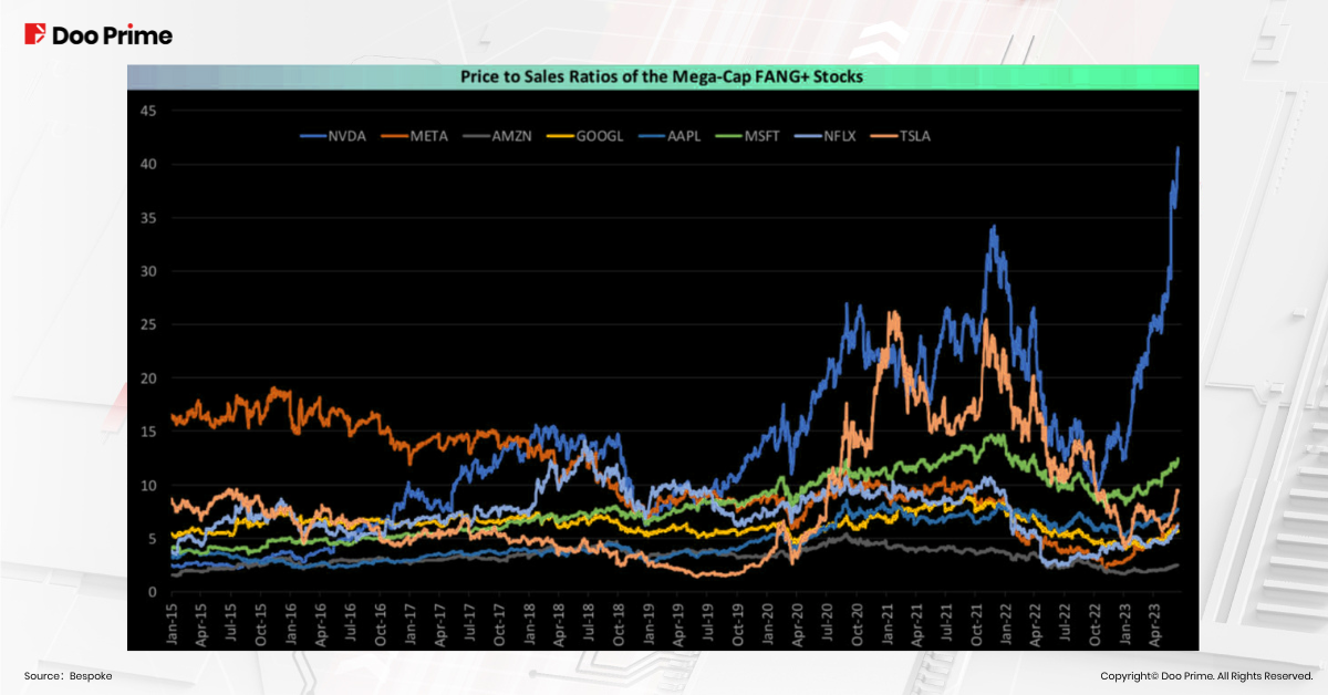 As of the time of writing, NVIDIA’s stock price has surged by a remarkable 207.72% since the beginning of the year, reaching an impressive USD 457.87. However, its price-to-sales ratio exceeds that of Meta, Amazon, Google, Apple, Microsoft, Netflix, and Tesla by a considerable margin. A higher price-to-sales ratio indicates a lower investment value for the company’s stock.