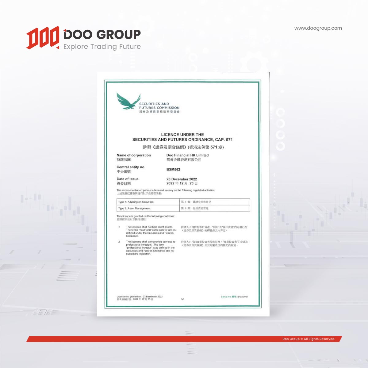 Doo Group 자회사인 Doo Financial HK Limited (중앙 번호: BSM562) 는 현재 홍콩 증권선물위원회 (홍콩 증권 감독 위원회) 에서 발급한 4종 (증권에 대한 조언) 과 9종 (자산관리 제공) 라이선스를 정식으로 승인받아 획기적인 돌파구를 실현했습니다.
