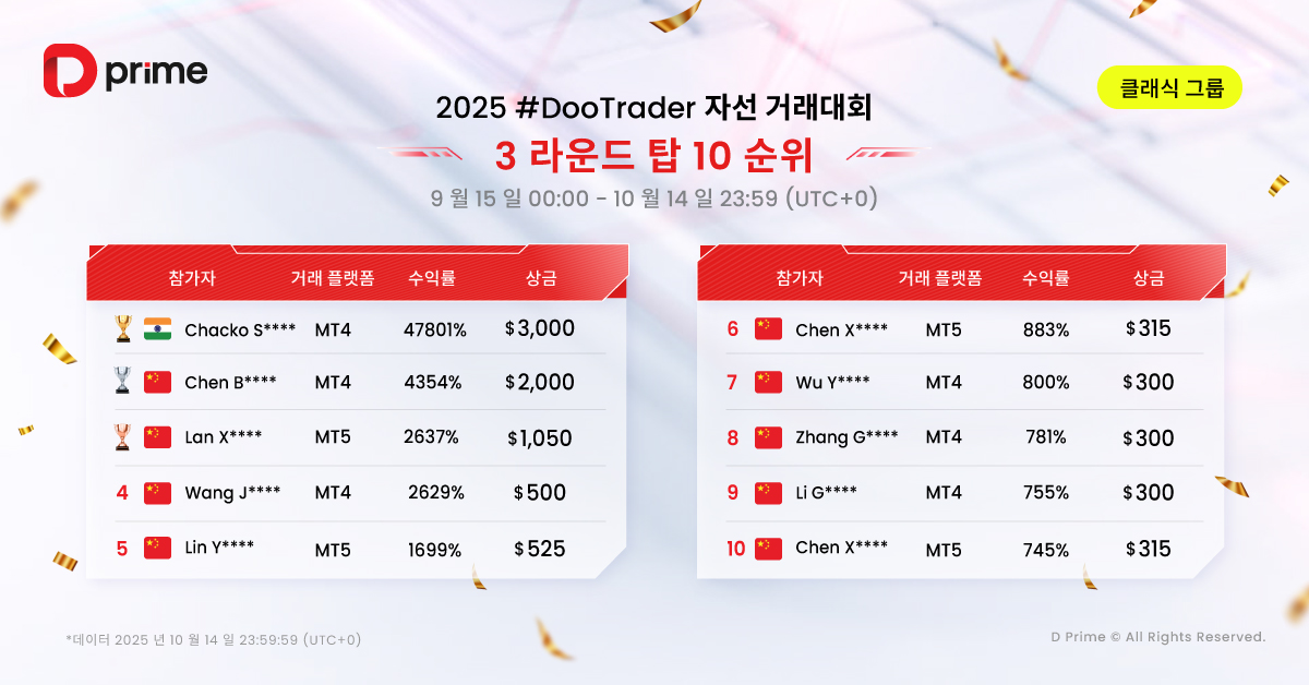 2025년 D Prime #DooTrader 자선 트레이딩 3라운드 월간 대회가 10월 14일23:59(UTC+0)에 성공적으로 마무리되었으며 최신 순위표가 공개되었습니다! 이어 4라운드 월간 대회가 2025년 10월 15일 00:00(UTC+0)에 개막했습니다. 전 세계의 트레이딩 고수 여러분, 지금 바로 참여하여 섬 결승전 진출의 주인공이 되어보세요!