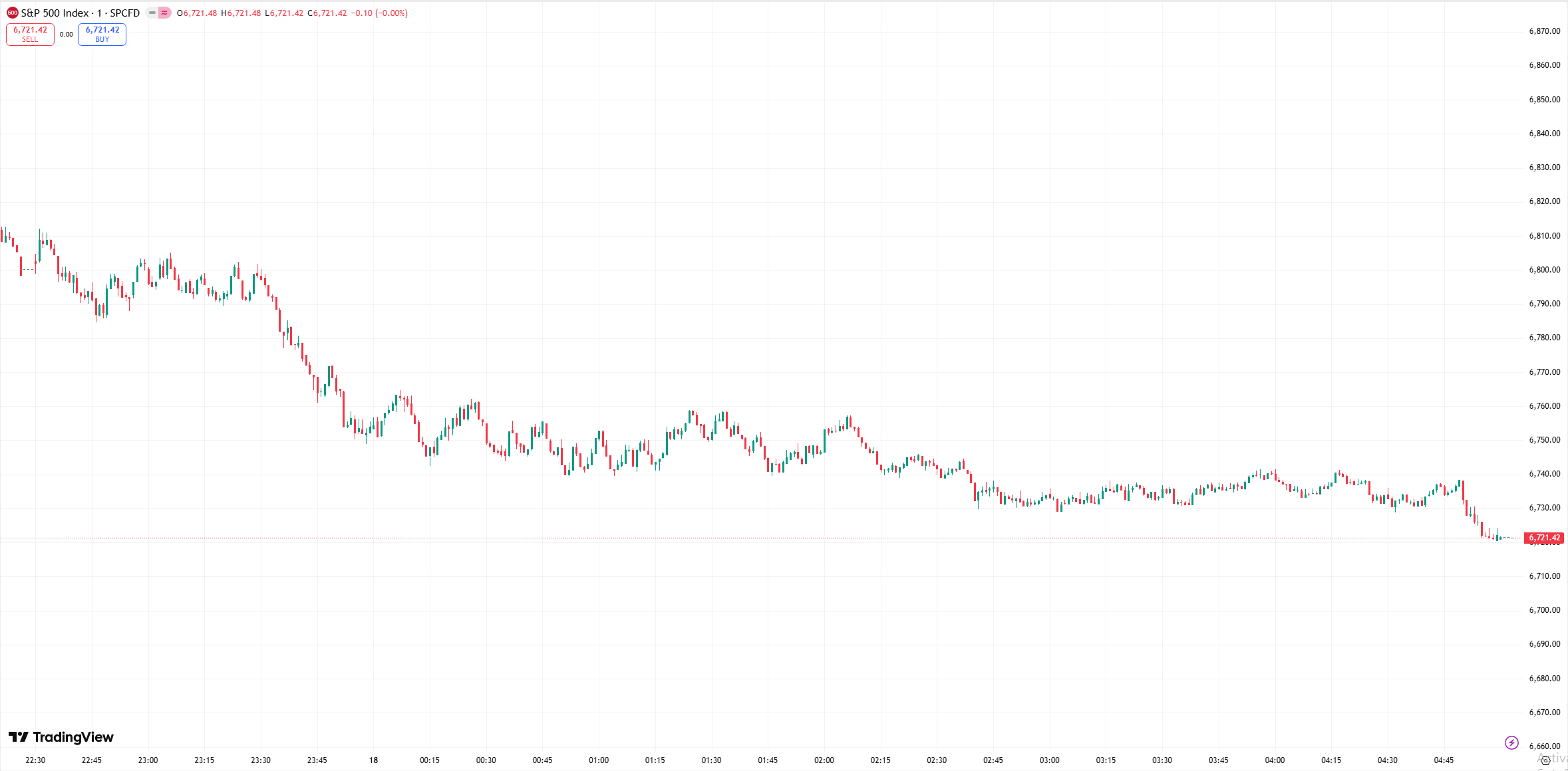 - S&P 500 fell 78.83 points (-1.16%) to 6,721.43