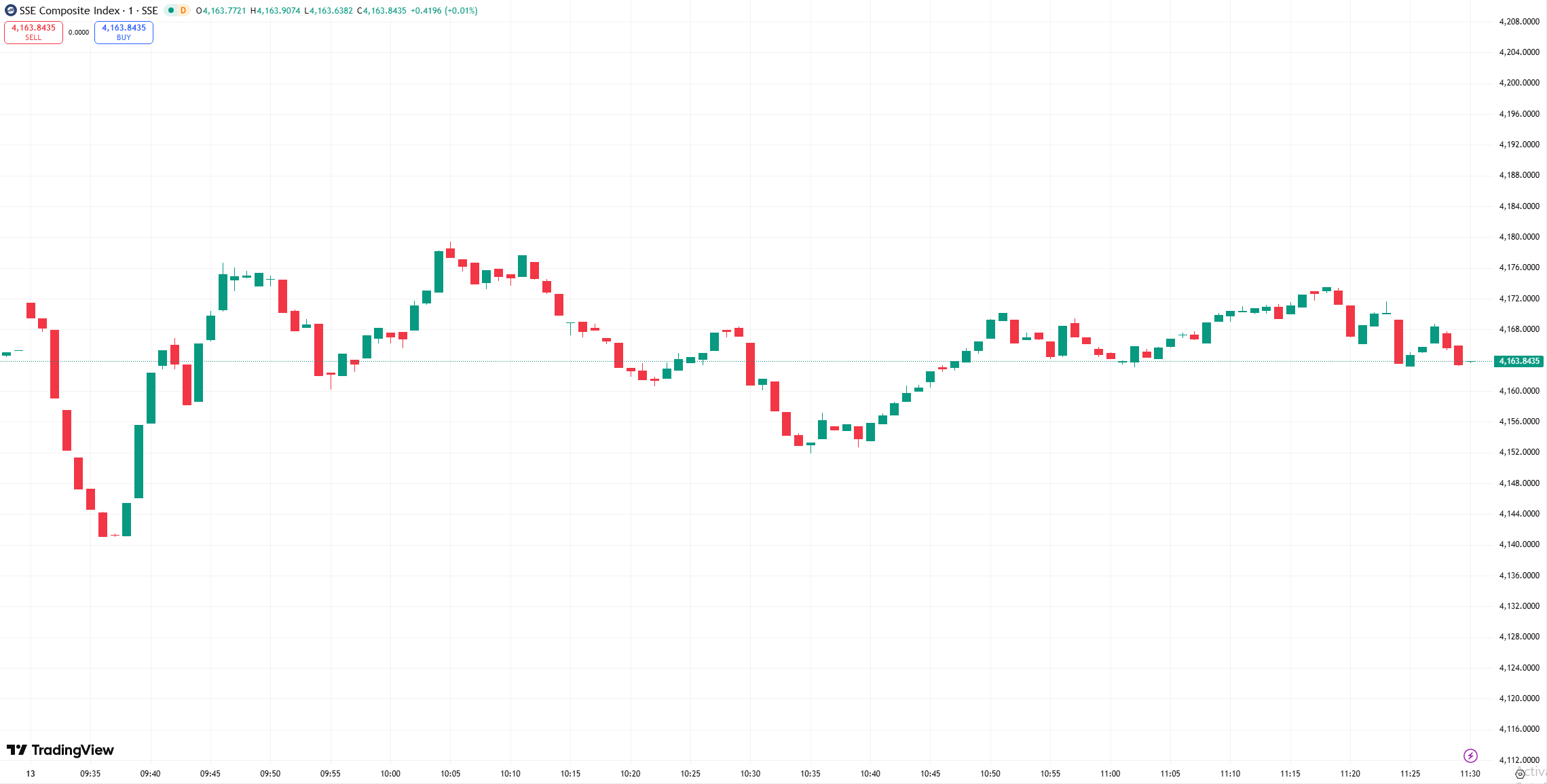 China’s A-shares traded lower. By midday, the Shanghai Composite slipped 0.03%, Shenzhen Component fell 0.31%, and the ChiNext Index dropped 0.83%. The Beijing 50 Index declined 0.27%. Total turnover reached RMB 246.84 billion, up from the previous session. More than 2,800 stocks fell.