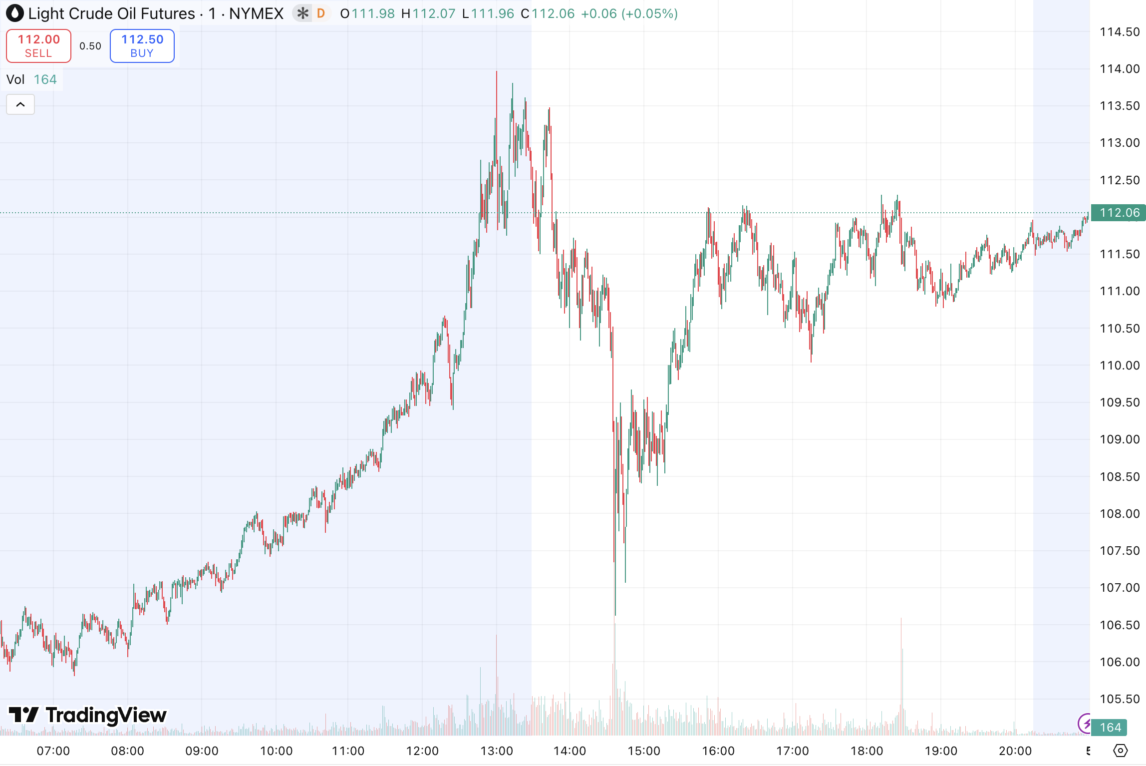 国际油价周四大幅跳涨,美原油收涨超 13% ,报收每桶 112.06 美元,创下 2020 年以来最大单日绝对值涨幅;布伦特原油期货收涨 7.78% ,报每桶 109.03 美元。受美国总统特朗普誓言将继续打击伊朗、且未给出结束敌对行动或重新开放霍尔木兹海峡的时间表影响。