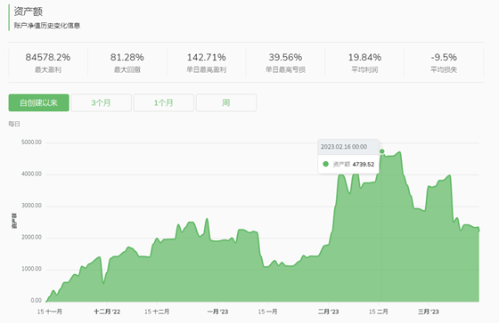 “小牛0001号”交易信号源创建于 2022 年 10 月 4 日,自创建以来,其收益率已经实现了大幅增长,整体回报率在一众信号源中可谓位列前茅。2023 年 2 月 16 日,其回报率达到了33,235.2% 的顶点,即回报率暴涨逾 330 倍有余。