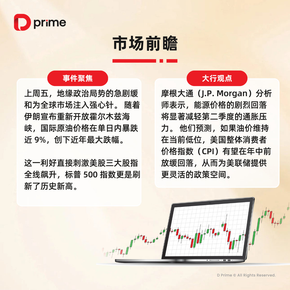 精选研报 | 上周五,标普首破 7100 点大关,纳指创 1992 年来最长连涨纪录,地缘政治局势的急剧缓和为全球市场注入强心针。摩根大通分析师表示,能源价格的剧烈回落将显著减轻第二季度的通胀压力。 还有哪些大事值得关注?下方图片速览: