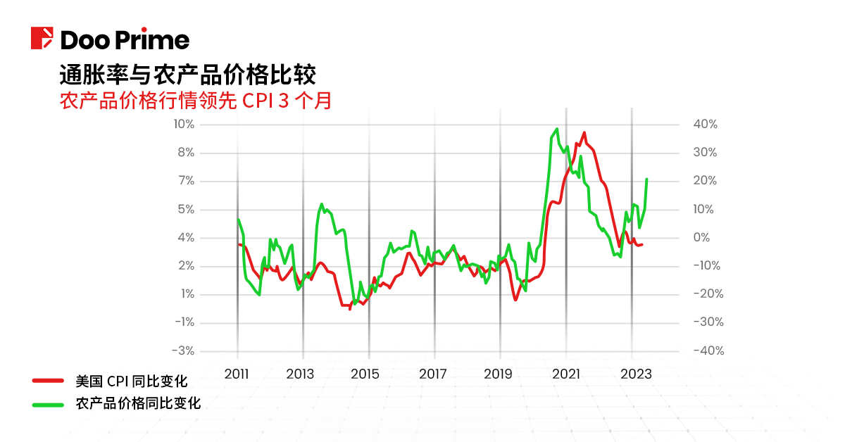 农产品价格从 2024 年初至今已上涨了 21%。从历史上看,它的行情通常领先消费者物价指数(CPI)3 个月。