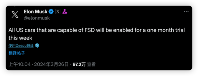 特斯拉宣布将向美国客户提供全自动驾驶(FSD)为期一个月的免费试用,其价格已经从 1.5 万美元降至 1.2 万美元。长期以来,马斯克一直宣称 FSD 可以成为公司的潜在利润来源。马斯克宣布提供 FSD 免费使用一个月后,特斯拉高开高走,早盘曾涨约 6.7%,午盘回吐过半涨幅,收涨 2.9%,连涨两日至 3 月 11 日以来收盘高位。