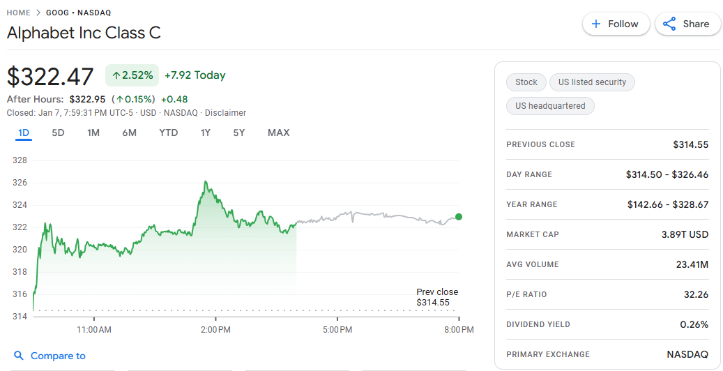 谷歌母公司 Alphabet 股价周三上涨 7.64 美元,涨幅 2.43%,收报 321.98 美元,距离 11 月 25 日创下的历史收盘高点 323.44 美元仅差不到 2 美元。随着股价走强,Alphabet 总市值攀升至 3.888 万亿美元,正式超越苹果 (AAPL) 的 3.85 万亿美元,成为全球第二大科技公司,仅次于英伟达 (NVDA,4.6 万亿美元)。