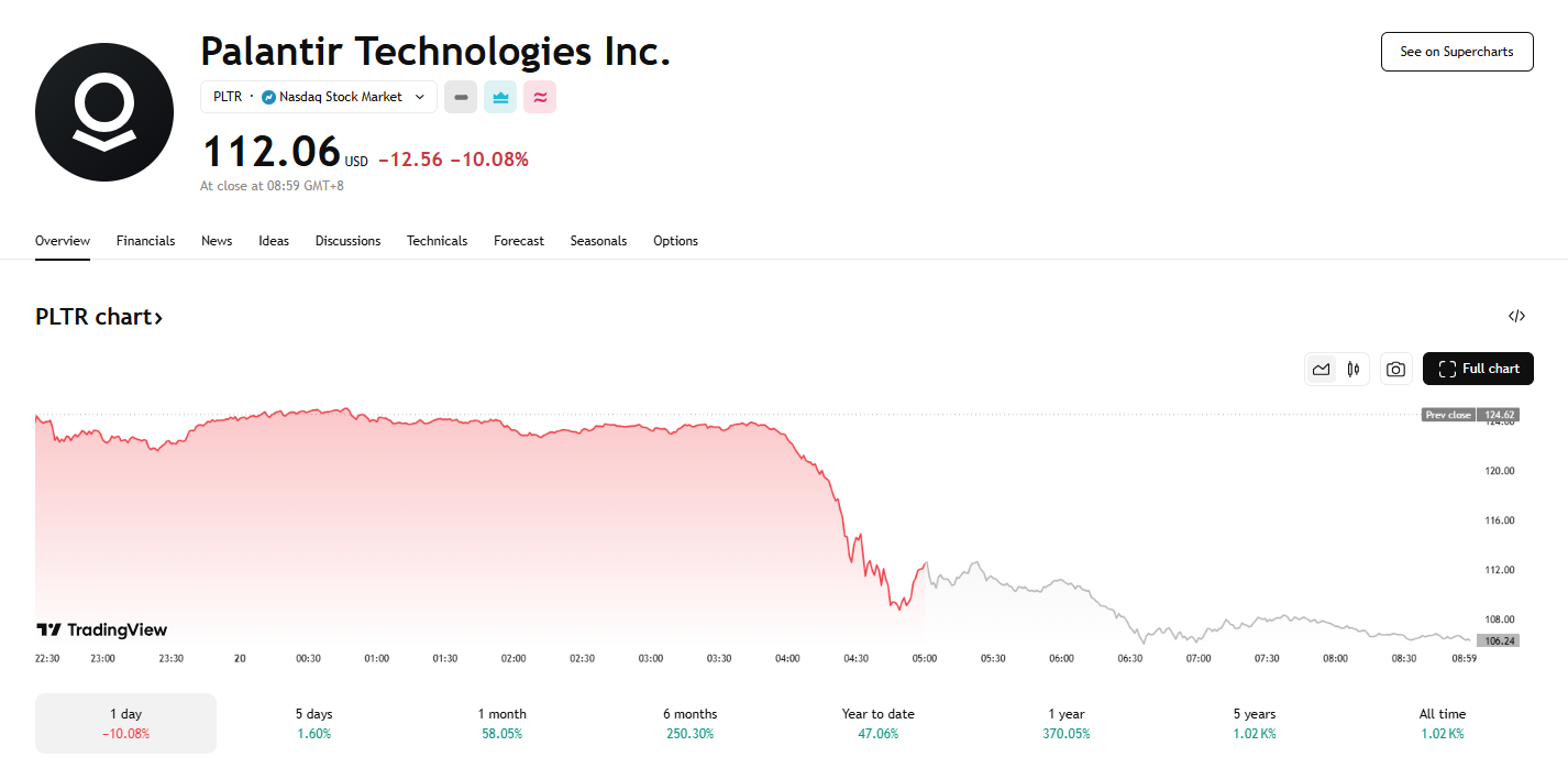 消息传出后,美国国防股承压,大型国防承包商 Palantir 股价应声下跌超 10%,并在盘后交易中继续走低。