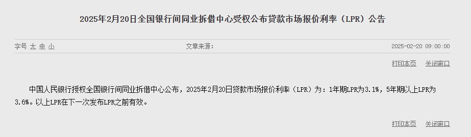 2 月 20 日,中国人民银行授权全国银行间同业拆借中心公布,2025 年 2 月 20 日 1 年期贷款市场报价利率(LPR)为 3.1%,5 年期以上 LPR 为 3.6%,均持平前值。