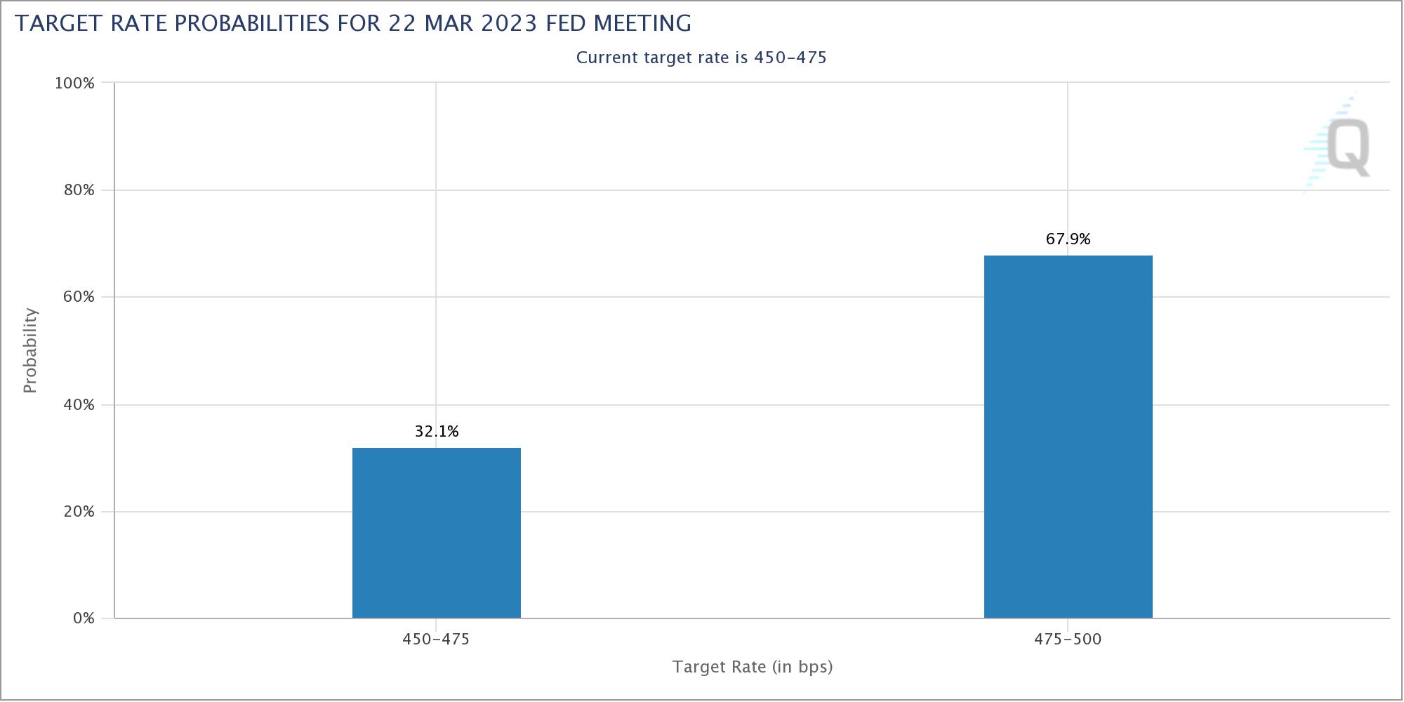 经济数据走软,加上对银行业的担忧日益加剧,美联储在下次会议维持利率不变的理由越来越多。根据“芝商所美联储观察工具( CME FedWatch Tool )”美联储在 3 月的政策会议上不加息的可能性为从昨日的 18.1% 上升到 32.1%,加息 25 个基点的可能性从 81.9% 骤减至 67.9%。