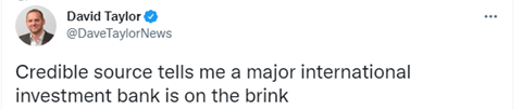 澳洲广播公司( ABC )旗下商业记者 David Taylor 根据“可靠消息”,在推特表示一间大型投资银行濒临破产。消息散播后引来热烈讨论,国外市场疯传百年银行巨头瑞士信贷( Credit Suisse )爆雷。
