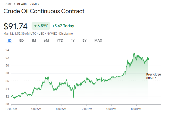 WTI 原油期货一度上涨 6.6%,至每桶 93.01 美元,继周三近 5% 的涨幅后连续第二日上涨。报道称,伊朗已通过地区中间方表明,若要停火,美国必须保证自身及以色列未来不会再对伊朗发动袭击。由于这一条件被认为难以被华盛顿接受,市场普遍下调对战争迅速结束的预期。