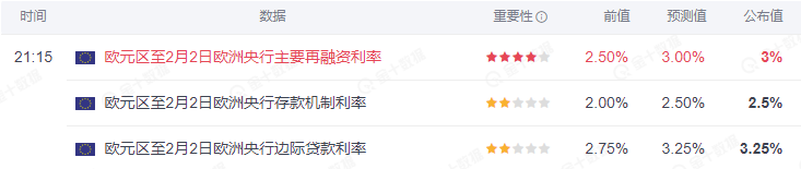 同日 21:15,欧洲央行公布最新政策决议,将三大主要利率均上调 50 个基点,符合市场预期,并明确表示下个月将再加息 50 个基点,重申将坚持对抗高通胀。目前欧元区主要再融资利率为 3%,存款便利利率为 2.5%,边际贷款利率为 3.25%。