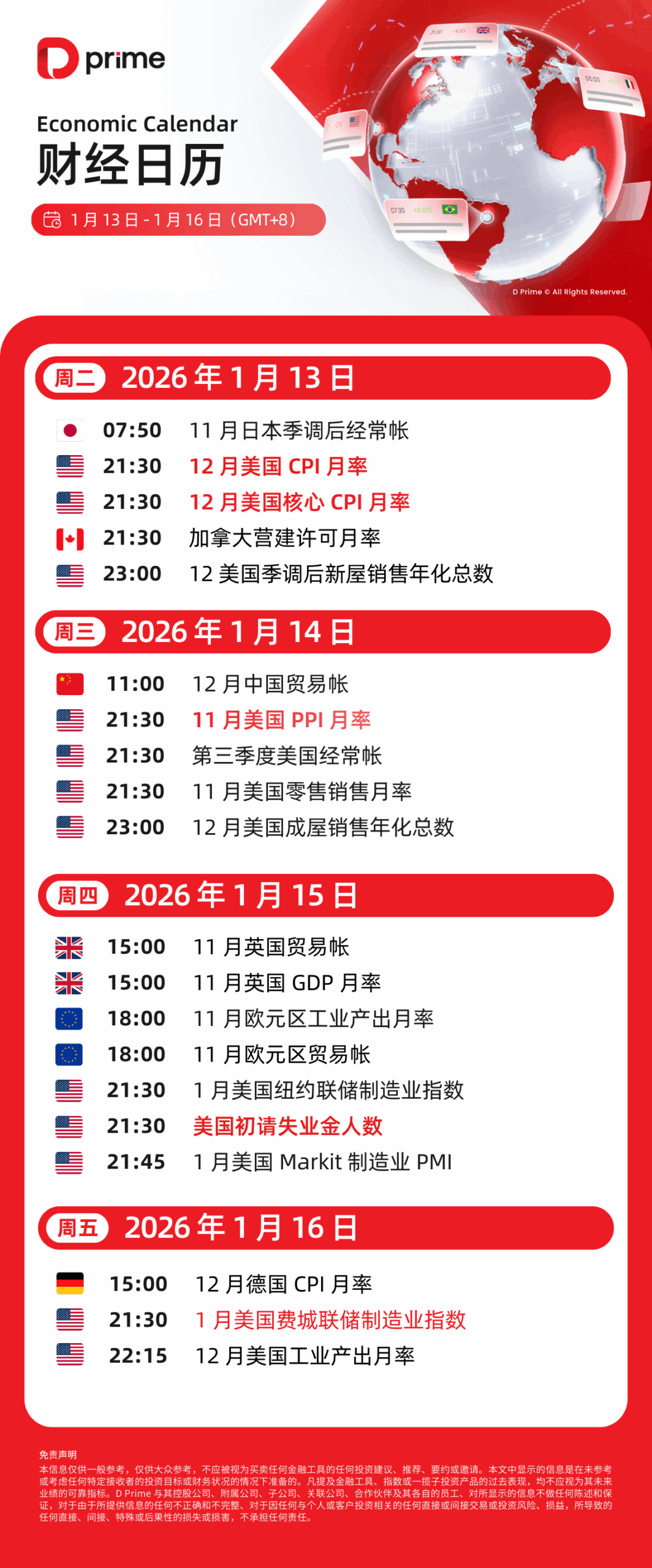 财经日历 | 以下为 2026 年 1 月 13 日至 2026 年 1 月 16 日(GMT+8 北京时间) 全球重大经济事件提醒。在重大行情期间,请确保您已审查您的保证金率,并有足够的保证金来支撑您的风险敞口。