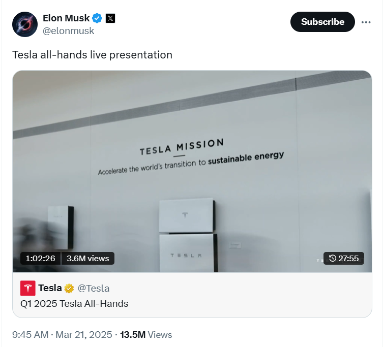 3 月 21 日,特斯拉 CEO 马斯克在得克萨斯州奥斯汀举行了一场全员会议,并在他的社交媒体网络 X 上直播了这次会议。马斯克成,尽管特斯拉遇到了“艰难时刻”,但大家仍应“继续持有”股票。