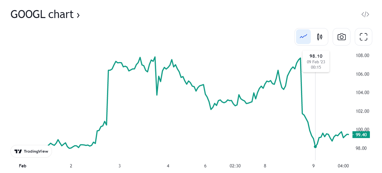 2 月 8 日,谷歌在官方宣传 AI 聊天机器人 Bard 的演示视频中犯了一个明显错误,其股价随即断崖式下跌,盘中跌近 10%,刷新日低至约 98 美元,市值蒸发超过 1000 亿美元。