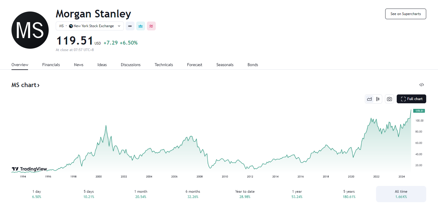 摩根士丹利公布的 2024 年第三季度业绩报告,主要财务指标均强于市场预期,且三大部门的收入都高出华尔街的预测,摩根士丹利美股早盘明显拉升,最高达每股 121.45 美元,刷新了历史记录。截至发稿,股价略有回落,涨幅约为 7%,报每股 119.51 美元。