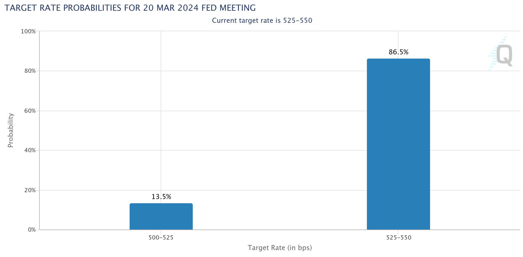 由于经济数据意外强劲,目前市场预计,美联储于 5 月份进行首次降息的可能性高达 90%,3 月份降息的可能性回落至 13.5%。