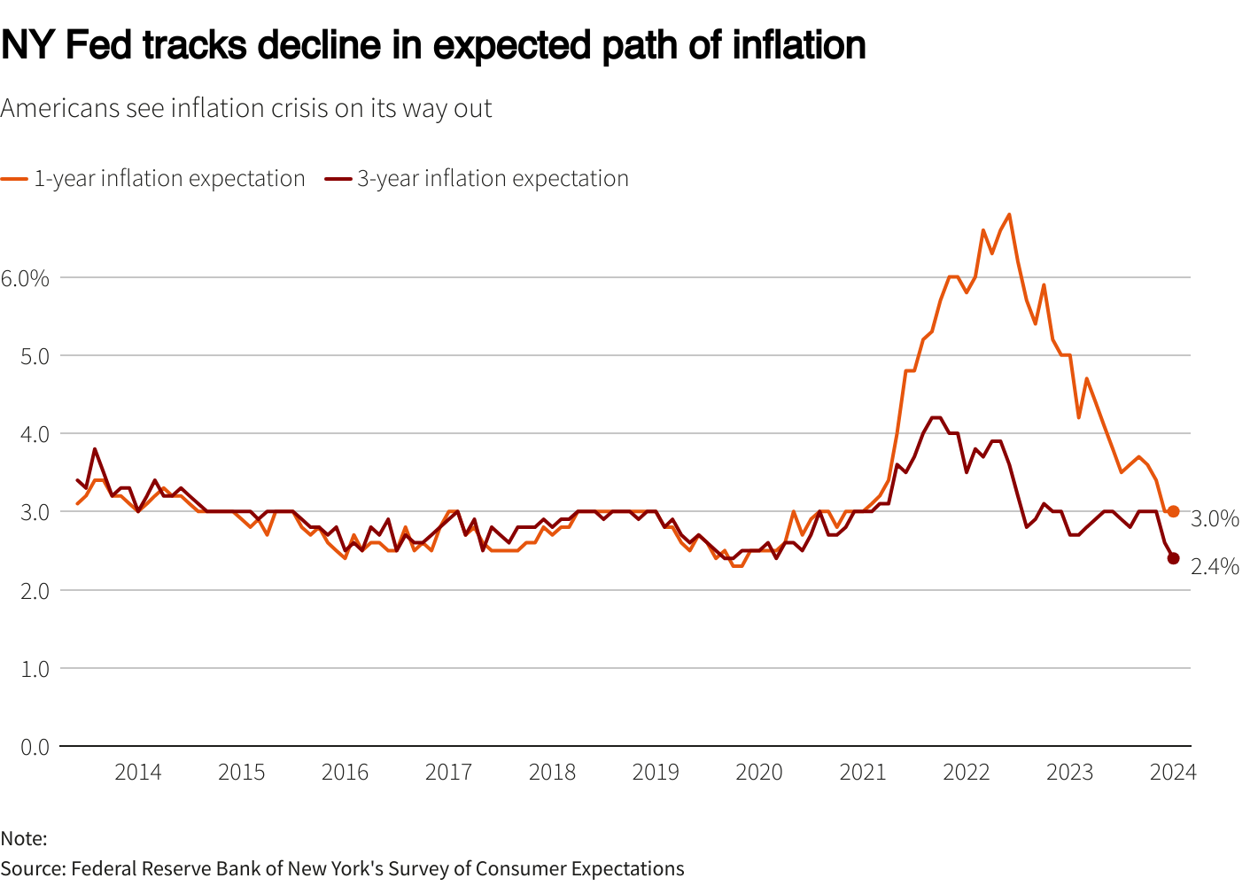 纽约联储公布的月度消费者调查结果显示,1 月份人们对未来三年的通胀率预期降至 2.35%,为有记录以来的最低。纽约联储的这项调查有约 11 年的时间,意味着中期通胀预期为至少 2013 年以来最低。人们对未来一年和五年的通胀率预期中值分别为 3% 和 2.5%,与上月调查持平。