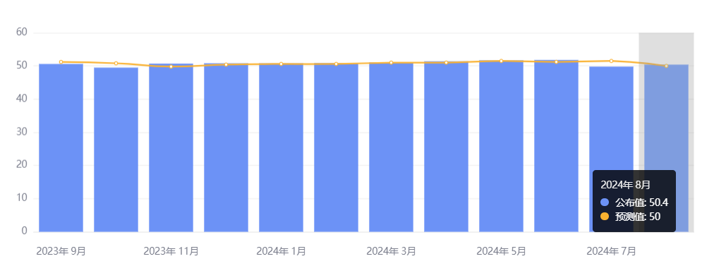 9 月 2 日,中国 8 月财新制造业 PMI 录得 50.4,高于预期数值 50,较 7 月回升 0.6 个百分点,重回荣枯线以上,显示制造业景气度在经过短暂放缓后恢复扩张。