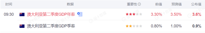 北京时间 9 月 7 日公布的澳大利亚第二季度 GDP 年率显示,截至 6 月份的三个月中,澳大利亚 GDP 可能较上一季度增长 3.6%,超出市场预期。