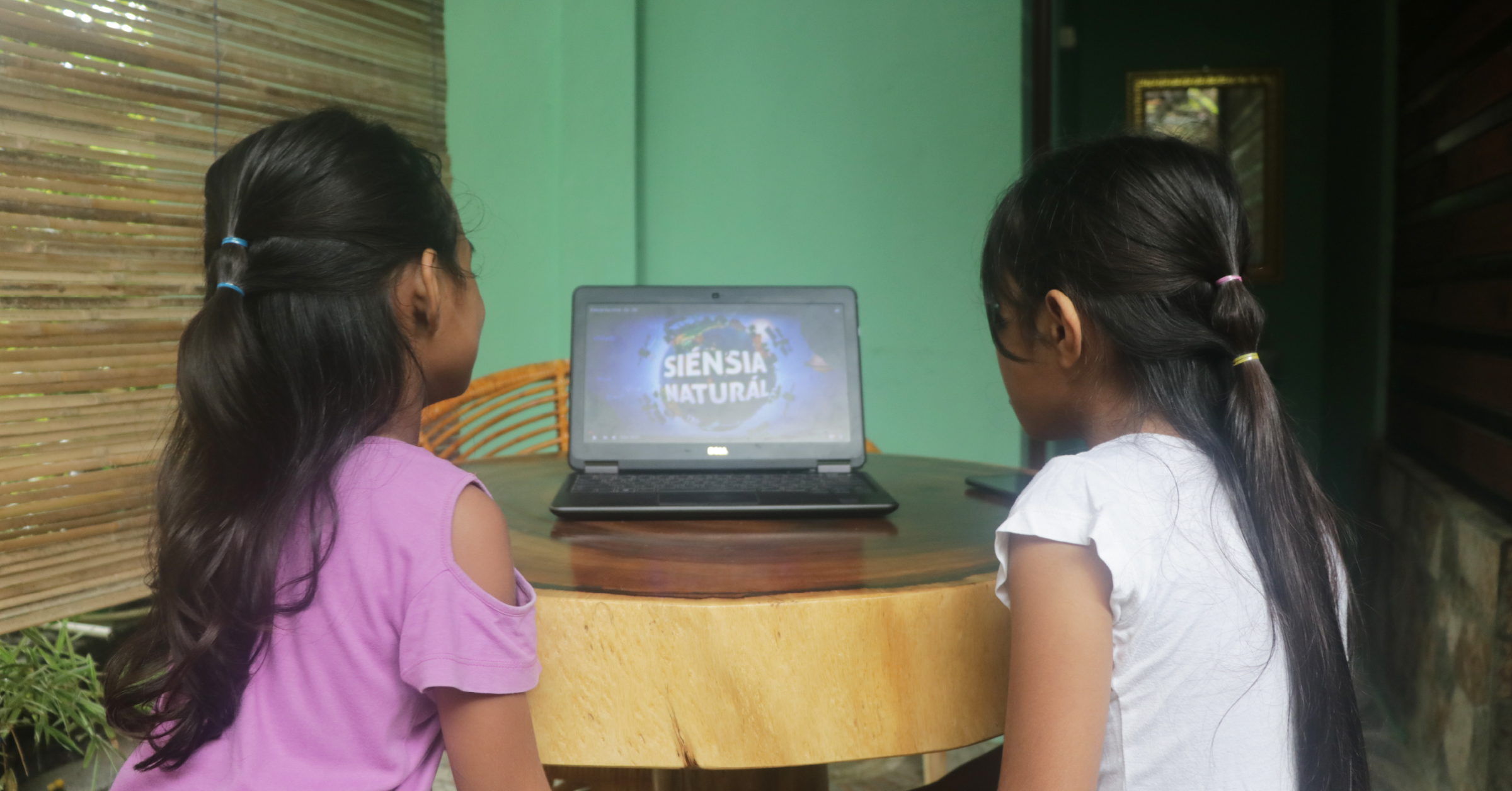 2020 年 4 月 14 日,两个小女孩通过在线学习平台观看学习视频。自 2020 年 3 月 23 日起,为响应国家新冠疫情防控政策,东帝汶的学校全部关闭。” The Learning Passport ” 在线教育平台提供了电视节目、广播节目和电子书,以及一本供家长向孩子们解释新冠疫情发展的书。东帝汶的学生和家长可以在该平台上获取一系列视听资料,供学生在学校关闭期间继续学习。