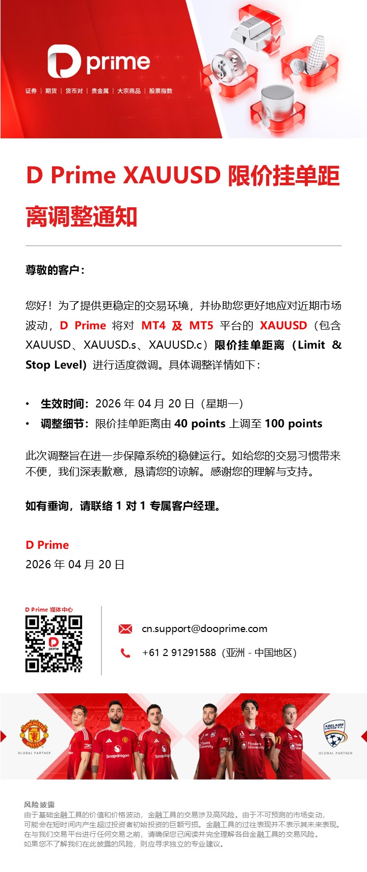 D Prime XAUUSD 限价挂单距离调整通知