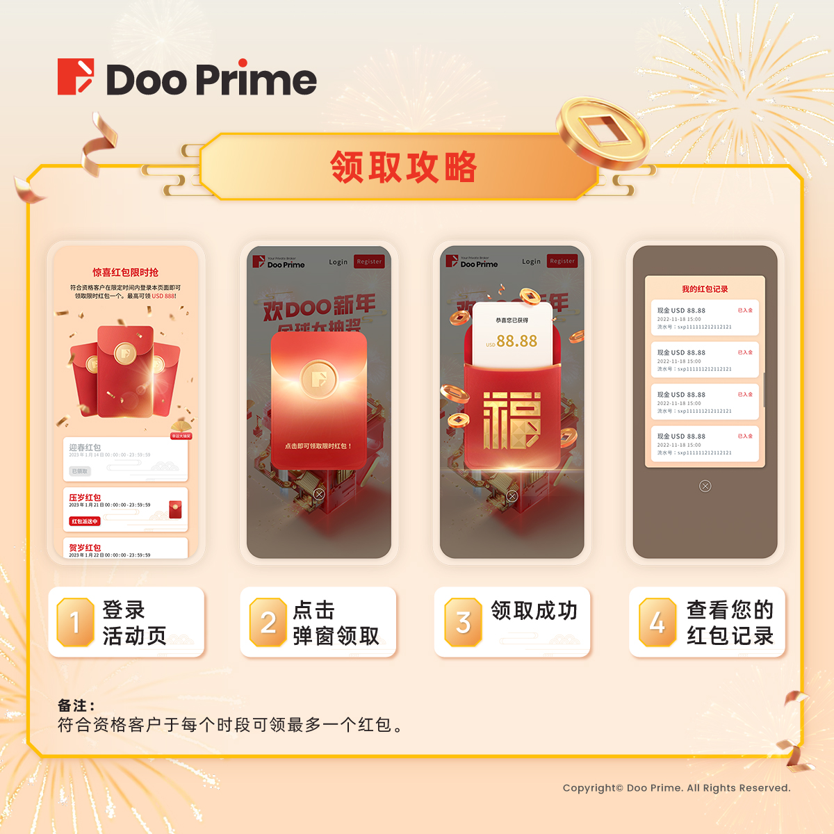 参与活动方式十分简单,只要您曾在 Doo Prime 入金 USD 100 + 交易 1 手,就有机会参与红包抽奖,最高可领取 USD 888 的发财红包!