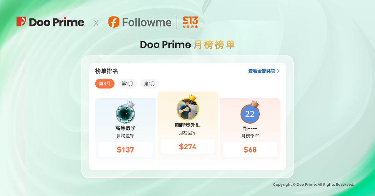FOLLOWME S13 交易大赛收官,Doo Prime 选手喜赢新手组冠军!