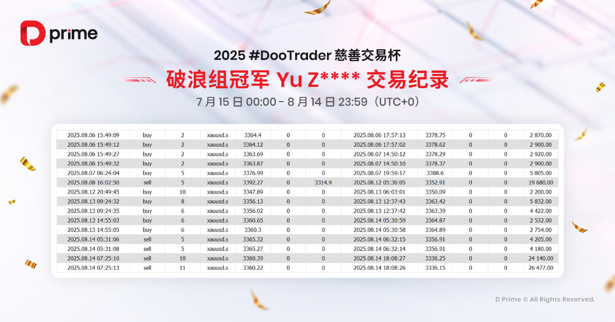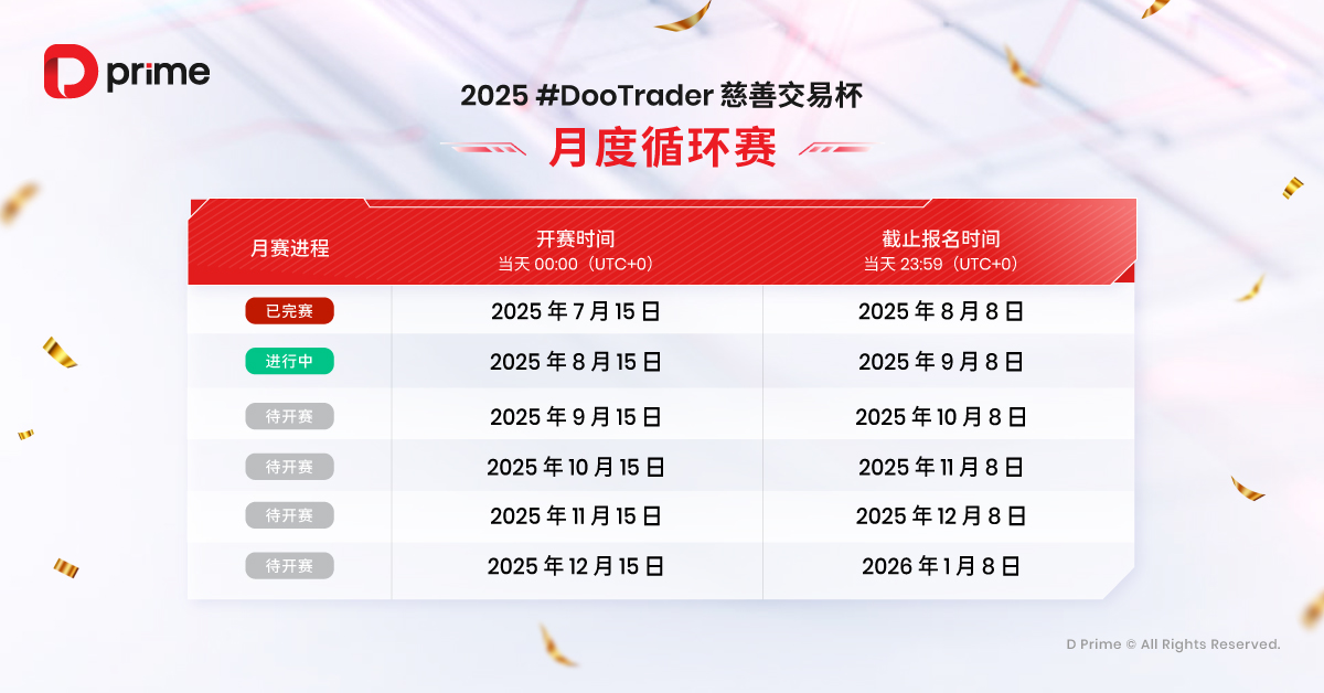 更值得一提的是,2025 #DooTrader 慈善交易杯将继续传递慈善之力。每当您在比赛中完成 1 手交易,D Prime 都将代表您捐出 0.1 美元,帮助改善贫困儿童的教育条件,让您的每一笔交易,不仅是收益,更是一份温暖的心意,助力点亮更多孩子的未来。