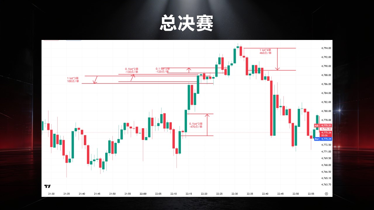 “我会把相近的交易资产放在一起看。那跟黄金对标的就是白银,在那个时候,白银出现了猎取流动性的行为,但黄金没有。所以对我来说,黄金可能是比较弱的一方,而我又是判断大趋势可能是做空为主的局面的时候,黄金在出现这样的价格行为时,就是我认为是胜率很高的时候,我就会去下重注”。 Trader X 忆述总决赛当晚的想法。