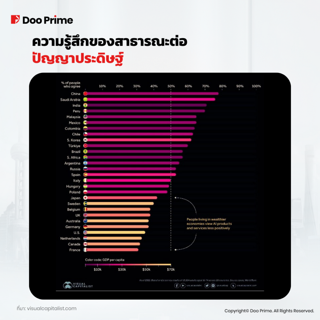 สหรัฐอเมริกาอยู่ในอันดับท้ายสุดอย่างน่าประหลาดใจ โดยมีเพียง 40% ของผู้คนที่มองว่า AI เป็นพลังเชิงบวกต่อเศรษฐกิจ