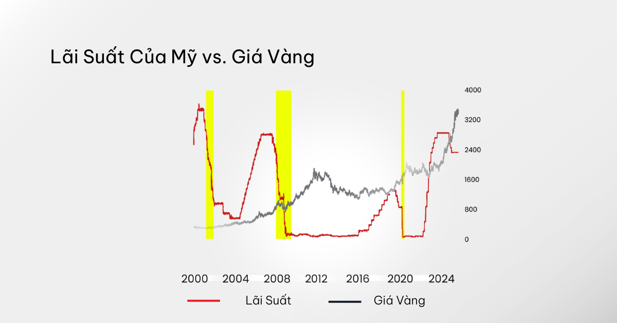 - 2001-2003: Fed cắt giảm lãi suất, vàng gần như tăng lên gấp đôi.