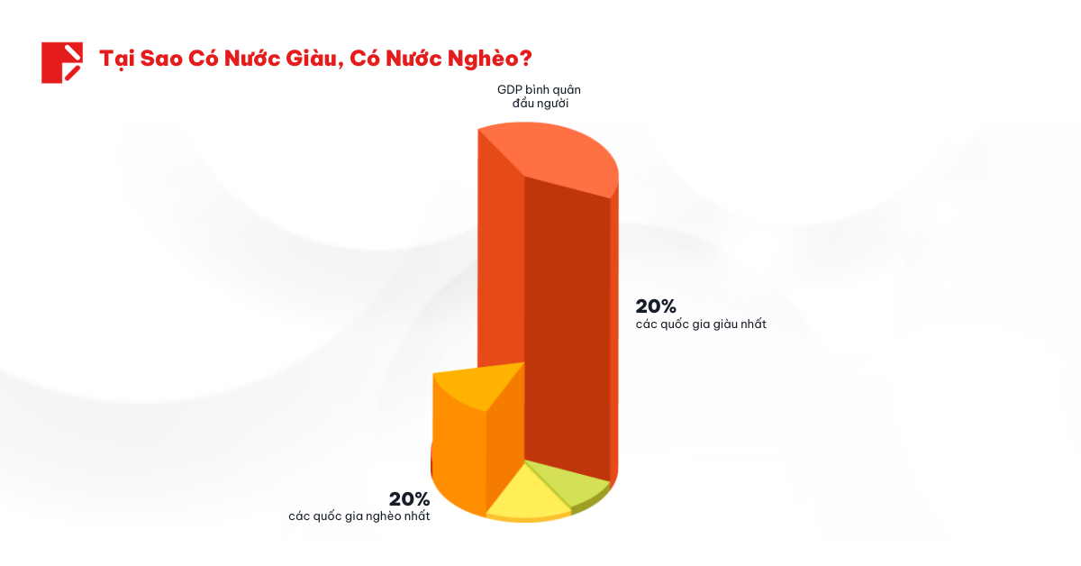20% các quốc gia giàu nhất thế giới hiện giàu hơn khoảng 30 lần so với 20% các quốc gia nghèo nhất. Hơn nữa, khoảng cách thu nhập giữa các quốc gia giàu nhất và nghèo nhất vẫn dai dẳng; mặc dù các quốc gia nghèo nhất đã trở nên giàu hơn, nhưng họ vẫn chưa bắt kịp với các quốc gia thịnh vượng nhất. Tại sao?