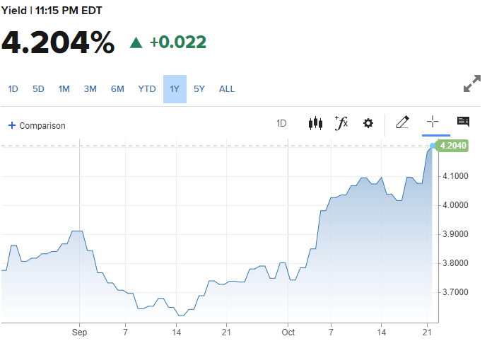 Lợi suất trái phiếu kho bạc Mỹ kỳ hạn 10 năm đã tăng gần 12 điểm cơ bản, lên mức 4,19%. Đây là nguyên nhân chính khiến các chỉ số chứng khoán Mỹ giảm điểm trong phiên này.